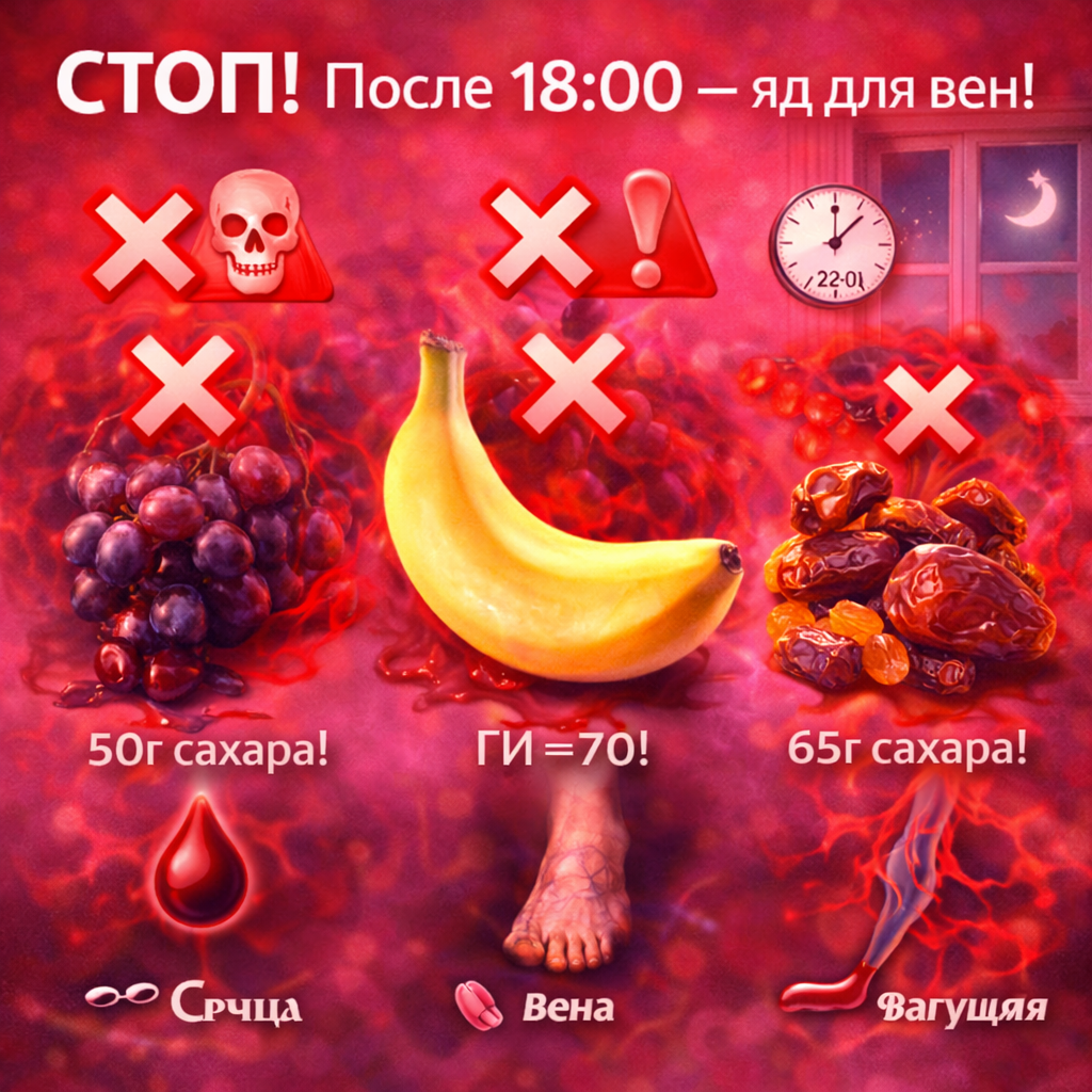 Виноград, бананы, сухофрукты — это концентрированный сахар. Вечером, когда метаболизм замедлен, они сгущают кровь, перегружают вены, вызывают отёки.