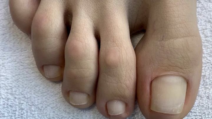 Признак 2: другой цвет ногтей на ногах (белесые, с полосками)